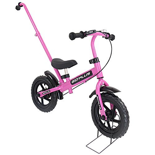 Goplus 12″ Kids Balance Bike No-Pedal Learn To Ride Pre Bike Push Walking Bicycle Adjustable Height with Bell Ring and Stand (Pink (with Handle))