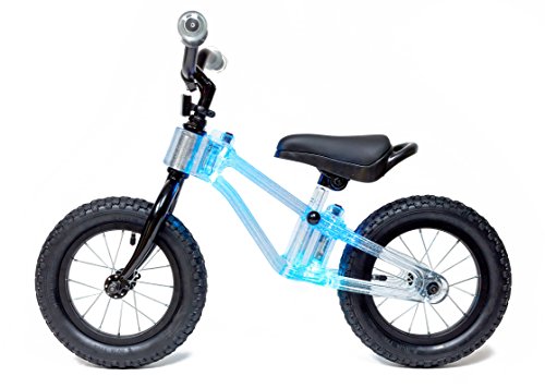 Balance bike that glows…an clear polycarbonate frame with 18 flashing LED lights mounted inside the frame. 12in pneumatic easy roll rubber tires, steel spoke rims, toddler size handgrips, saddle w/handle, adjustable seat height and adjustable handle bars. Designed in California.