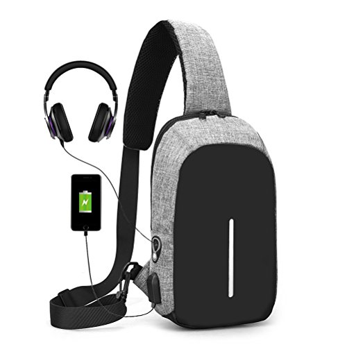 Sling Bag with USB Charging Port & Headphone Hole, Smart Crossbody Bag College School Chest Casual Daypack Travel Shoulder Backpack for Women Men Outdoor Sport Gym Hiking Cycling Day Trip – Gray