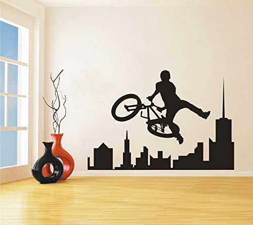 Sport Bike BMX Wall Decal Removable Amazing Extreme sport BMX City Skyline Wall Sticker Home Living Room Interior Home Decor Teen Boys Room Sports Decal Murals NY-374 (57X83CM, BLACK)