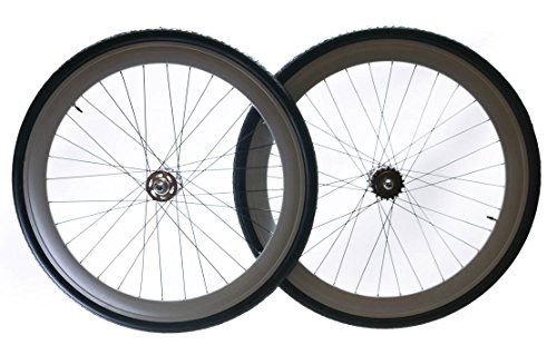 TRACK / FIXED GEAR URBAN BIKE WHEELSET NEW TAKE OFFS / MSRP $199.99 / SHIPS IN 24HRS SPECIFICATIONS: Manufacturer: Unknown Wheel size: 700c Rim Height: 50mm Rim Color: Gray Rim material: Aluminum  Valve drilling: Presta Front hub: 100mm spacing, 3/8″ axle, 32H Rear hub: 110mm spacing, 3/8″ axle, 32H, fixed gear compatible on one side, single speed freewheel compatible on the other Hub material: Aluminum Bearing type: Unsealed, ball / cone type Spokes: Stainless, black coated Nipples: Brass Includes 700 x 32c Tires, 85psi max, and tubes Includes 18T freewheel, and 18T fixed cog  Mass: 2300 grams front with tire / tube, 2510 grams rear with tire, tube, and cogs Condition: New take offs from unused bikes  Note: Cone/Ball bearing hubs are the most common type of bike wheel bearing on planet earth. However to ensure the smoothest rolling wheel possible and to ensure the longest life span of the hub, it’s adviseable that the buyer learn to service them both at the beginning and throughout the life of the wheels. Cone nut adjustments are simple, and smoothing out rough or hard to turn axles are as simple as adjusting the cones nuts.
